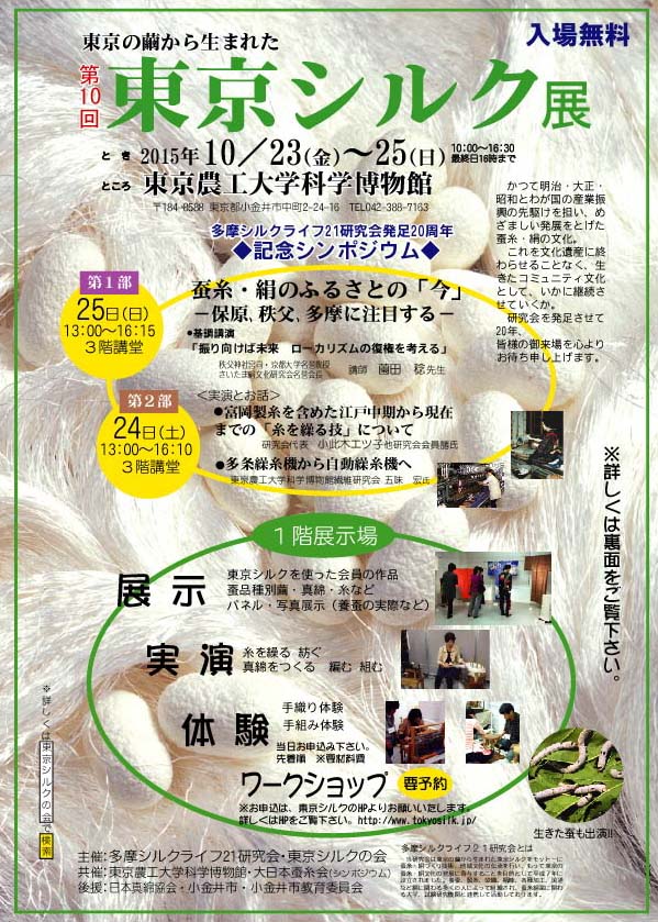 | ◆第10回東京シルク展開催のお知らせ◆ と き 平成27年10月23日(金)~25日(日) 10:00~16:30 最終日16:00まで ところ 東京農工大学科学博物館 〒184-8588 東京都小金井市中町2-2-16 ※ワークショップの内容や申し込みはこちらからどうぞ |