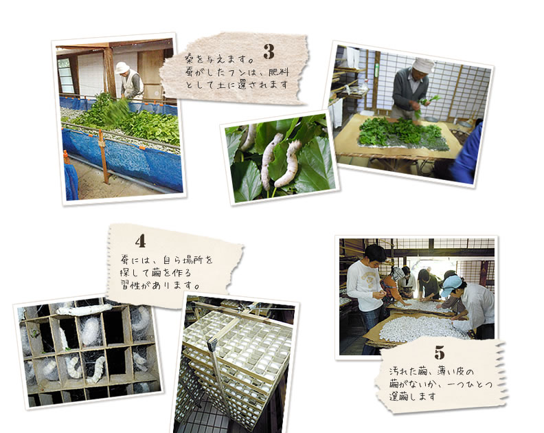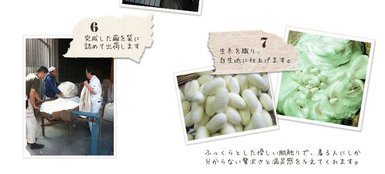 従来のように繭を乾燥させず、生のまま糸をつむぐため糸にストレスをかけず引き出すことが出来るそう。そうするとより光沢があってふっくらした肌触りになります。染め屋さんに、「東京シルクは色がきれいに出る」と言われるのもそのおかげかも。